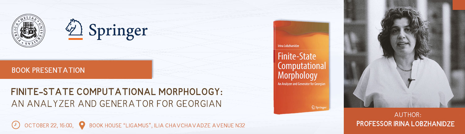 The presentation of Professor Irina Lobzhanidze’s book “Finite-State Computational Morphology: An Analyzer and Generator for Georgian (see Springer Publishing https://link.springer.com/book/10.1007/978-3-030-90248-3) will be held at the book house “Ligamus” of Ilia State University on October 22, at 16:00.