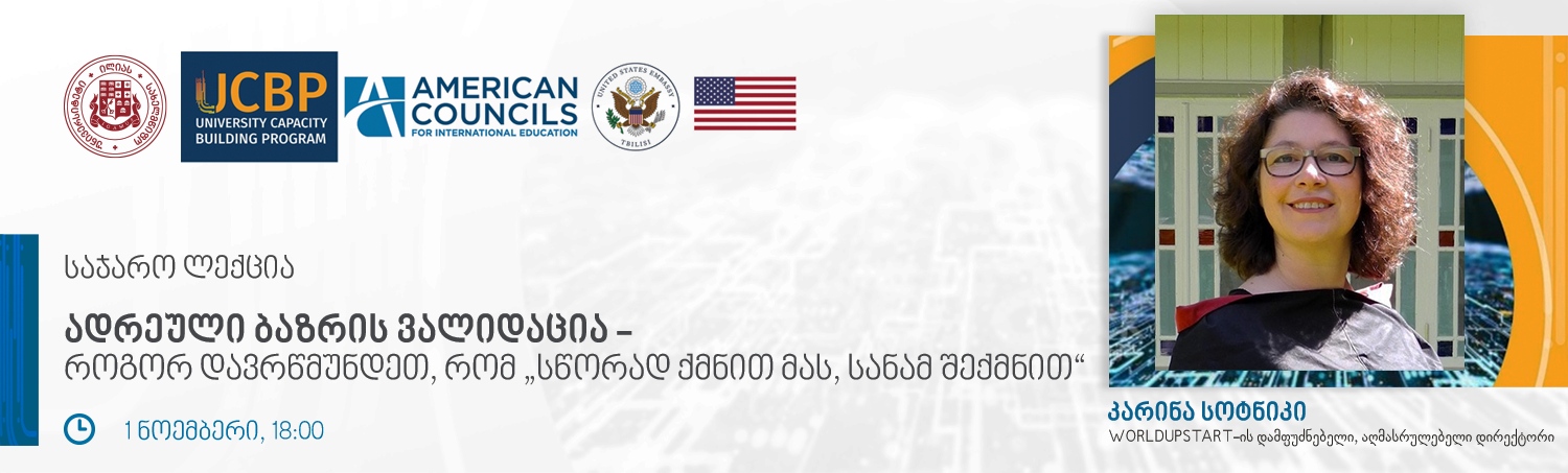 1 ნოემბერს, 18:00 საათზე, ილიას სახელმწიფო უნივერსიტეტში, უნივერსიტეტების შესაძლებლობების განვითარების პროგრამის ფარგლებში, გაიმართება WorldUpstart-ის დამფუძნებლისა და აღმასრულებელი დირექტორის, კარინა სოტნიკის საჯარო ლექცია: „ადრეული ბაზრის ვალიდაცია-როგორ დავრწმუნდეთ, რომ „სწორად ქმნით მას, სანამ შექმნით“