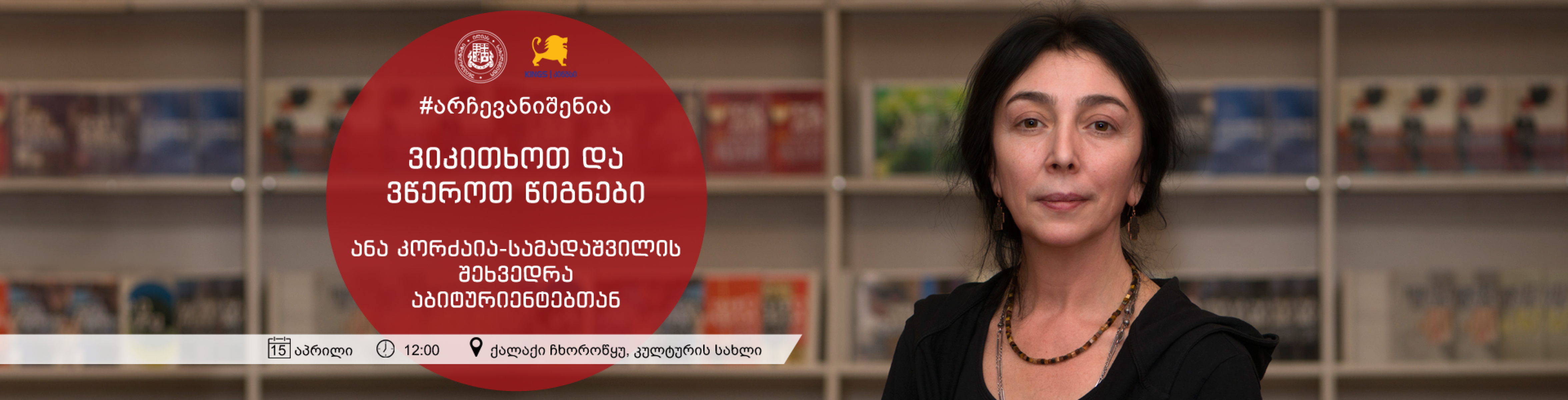 15 აპრილს, 12:00 საათზე, ჩხოროწყუს კულტურის სახლში (დავით აღმაშენებლის N6) ილიას სახელმწიფო უნივერსიტეტის პროფესორი, მწერალი ანა კორძაია-სამადაშვილი აბიტურიენტებთან გამართავს შეხვედრას, გაესაუბრება პროფესიის არჩევაზე და საჯარო ლექციას წაუკითხავს თემაზე: „ვიკითხოთ და ვწეროთ წიგნები“.