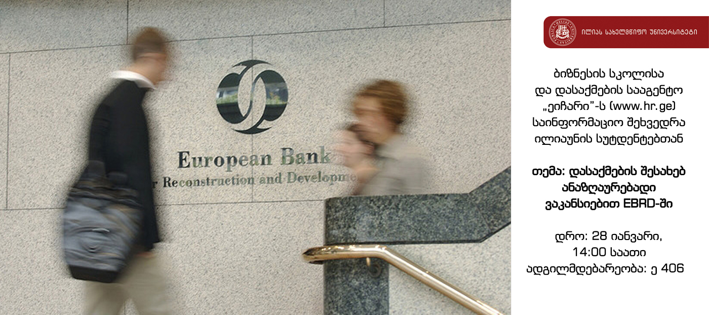 28 იანვარს 14:00 საათზე, ილიას სახელმწიფო უნივერსიტეტის E 406 აუდიტორიაში, ილიაუნის ბიზნესის სკოლა ატარებს საინფორმაციო ხასიათის შეხვედრას ბიზნესის სკოლაში მიმდინარე დასაქმების პროგრამების, მათ შორის, ამჟამად არსებული კონკრეტული ვაკანსიების შესახებ.