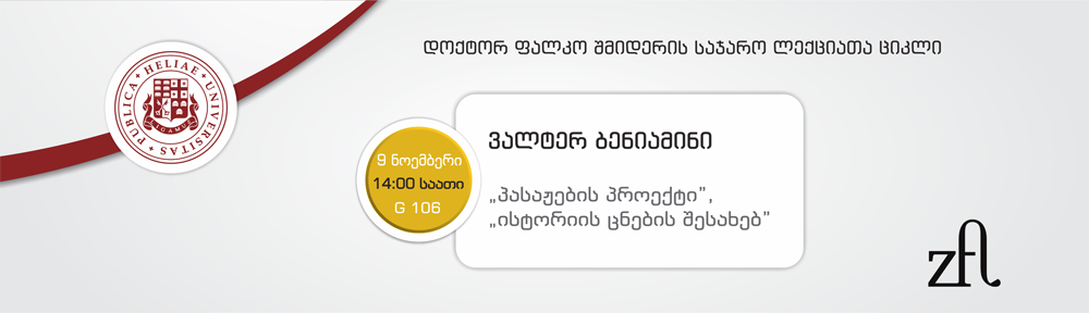 9 ნოემბერს, 14:00 საათზე, ილიას სახელმწიფო უნივერსიტეტის G106 აუდიტორიაში, ილიაუნის სოციალური და კულტურის კვლევის ინსტიტუტის მოწვევით, XX საუკუნის დიდ მოაზროვნეთა შესახებ ლექციათა ციკლის ფარგლებში, ბერლინის ლიტერატურისა და კულტურის კვლევის ცენტრის (ZfL) მკვლევარი, დრ. ფალკო შმიდერი წაიკითხავს საჯარო ლექციას თემაზე: ვალტერ ბენიამინი – „პასაჟების პროექტი“, “ისტორიის ცნების შესახებ”.