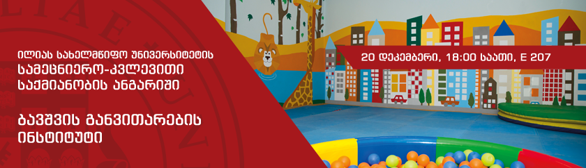 20 დეკემბერს, 18:00 საათზე, ილიას სახელმწიფო უნივერსიტეტის E207 აუდიტორიაში (ჩოლოყაშვილის გამზ. #3/5), ილიაუნის სამეცნიერო-კვლევითი საქმიანობის ანგარიშის ფარგლებში, სამეცნიერო-კვლევითი პროექტების პრეზენტაციებს წარადგენს ილიას სახელმწიფო უნივერსიტეტის ბავშვის განვითარების ინსტიტუტი.