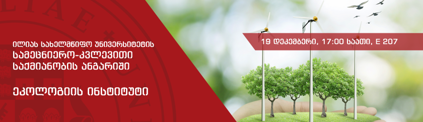 19 დეკემბერს, 17:00 საათზე, ილიას სახელმწიფო უნივერსიტეტის E 207 აუდიტორიაში (ჩოლოყაშვილის გამზ. #3/5), ილიაუნის სამეცნიერო-კვლევითი საქმიანობის ანგარიშის ფარგლებში, სამეცნიერო-კვლევითი პროექტების პრეზენტაციებს წარადგენს ილიას სახელმწიფო უნივერსიტეტის ეკოლოგიის ინსტიტუტი.