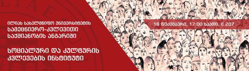 16 დეკემბერს, 17:00 საათზე, ილიას სახელმწიფო უნივერსიტეტის E207 აუდიტორიაში (ჩოლოყაშვილის გამზ. #3/5), ილიაუნის სამეცნიერო-კვლევითი საქმიანობის ანგარიშის ფარგლებში, სამეცნიერო-კვლევითი პროექტების პრეზენტაციებს წარადგენს ილიას სახელმწიფო უნივერსიტეტის სოციალური და კულტურის კვლევების ინსტიტუტი.
