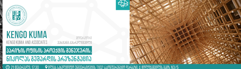 21 თებერვალს, 17:30 საათზე, ილიას სახელმწიფო უნივერსიტეტის T102 საკონფერენციო დარბაზში კომპანია Kengo Kuma And Associates-ის არქიტექტორი ნიკოლას გეშარდი გამართავს პრეზენტაციას KKAA-ის ფილოსოფიისა და შეხედულებების შესახებ.