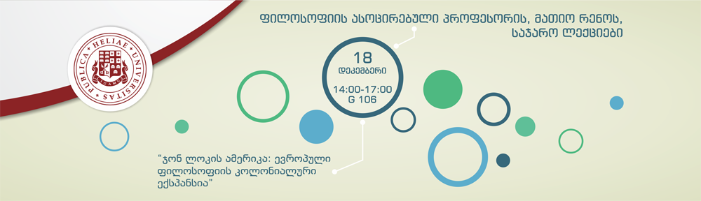 18 დეკემბერს, 14:00 საათზე, ილიას სახელმწიფო უნივერსიტეტის G 106 აუდიტორიაში, ილიაუნის სოციალური და კულტურის კვლევების ინსტიტუტის ორგანიზებით, პარი 8 ვენსენ სენ-დენის უნივერსიტეტის ფილოსოფიის ასოცირებული პროფესორი, მათიო რენო, წაიკითხავს საჯარო ლექციას – “ჯონ ლოკის ამერიკა: ევროპული ფილოსოფიის კოლონიალური ექსპანსია”.