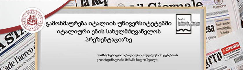 15 თებერვალს, 16:00 საათზე, ილიას სახელმწიფო უნივერსიტეტის იტალიური კულტურის ცენტრში (S 501 ოთახი) გაიმართება პრეზენტაცია : გამოხმაურება იტალიის უნივერსიტეტებში იტალიური ენის სახელმძღვანელოს პრეზენტაციაზე