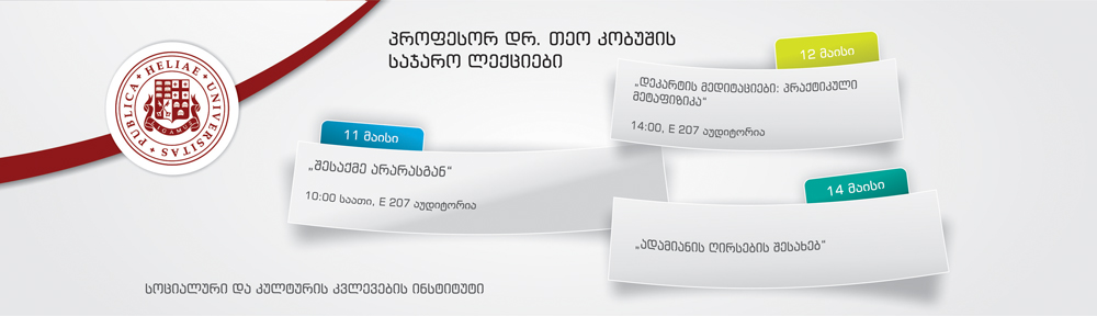 11, 12 და 14 მაისს, ილიას სახელმწიფო უნივერსიტეტის E კორპუსში, ილიაუნის სოციალური და კულტურის კვლევების ინსტიტუტის მოწვევით, პროფ. დრ. თეო კობუში ჩაატარებს 3 საჯარო ლექციას.