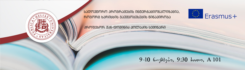 9-10 ნოემბერს, 9:30 საათზე, ილიას სახელმწიფო უნივერსიტეტის A101 აუდიტორიაში, Erasmus+ის ეროვნული ოფისის ორგანიზებით, პარიზის პიერ და მარი კიურების უნივერსიტეტის პროფესორი, ჟან-დომინიკ პოლაკი (Jean-Dominique Polack), ჩაატარებს სემინარს თემაზე: სადოქტორო პროგრამების ინტერნაციონალიზაცია, როგორც ხარისხის გაუმჯობესების წინაპირობა (Internationalization of doctoral programmes as precondition for quality enhancement).