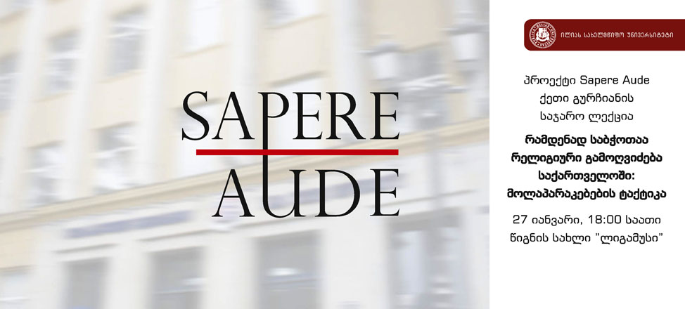 27 იანვარს, 18:00 საათზე, ილიას სახელმწიფო უნივერსიტეტის წიგნის სახლში ”ლიგამუსი”, სტუდენტური პროექტის – “Sapere Aude” – ფარგლებში, ილიაუნის ასოცირებული პროფესორი ქეთი გურჩიანი წაიკითხავს საჯარო ლექციას თემაზე: “რამდენად საბჭოთაა რელიგიური გამოღვიძება საქართველოში: მოლაპარაკებების ტაქტიკა“.