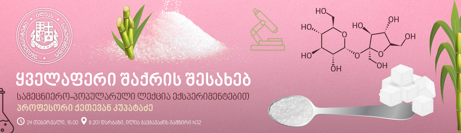 24 თებერვალს, 16:00 საათზე, ილიას სახელმწიფო უნივერსიტეტის საბუნებისმეტყველო მეცნიერებებისა და მედიცინის ფაკულტეტის პროფესორი ქეთევან კუპატაძე მოსწავლეებისთვის გამართავს სამეცნიერო-პოპულარულ ლექციას „ყველაფერი შაქრის შესახებ“ ექსპერიმენტებით.