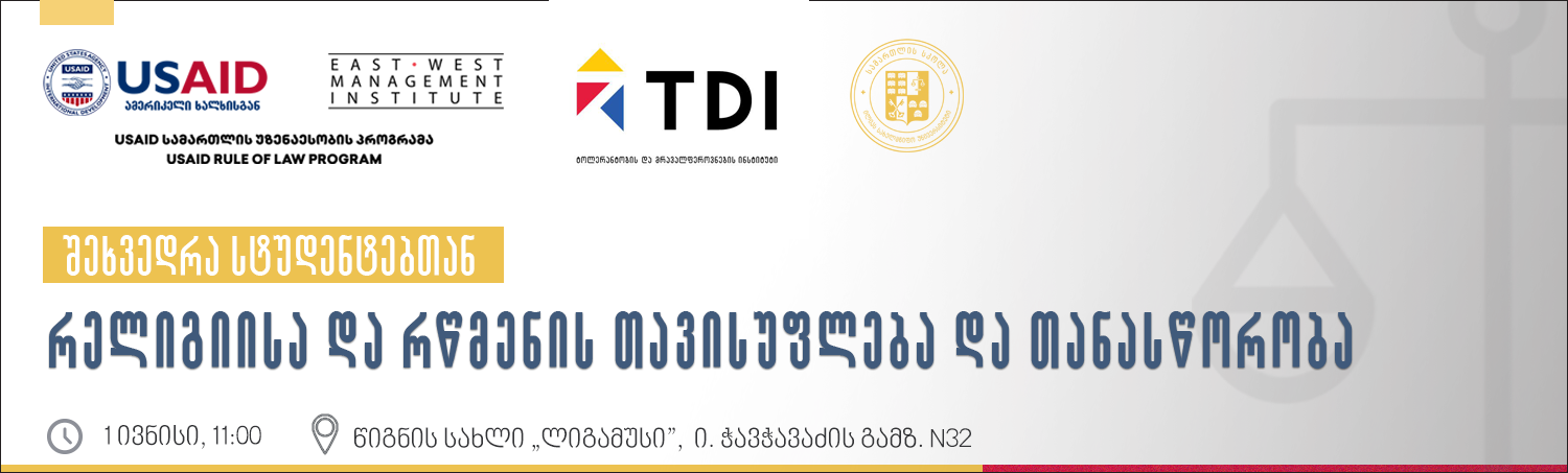 1 ივნისს, 11:00 საათზე, წიგნის სახლში „ლიგამუსი” არასამთავრობო ორგანიზაცია ტოლერანტობისა და მრავალფეროვნების ინსტიტუტის (TDI) წარმომადგენლები, USAID სამართლის უზენაესობის პროგრამის მხარდაჭერით ილიას სახელმწიფო უნივერსიტეტის სტუდენტებთან გამართავენ შეხვედრას თემაზე: რელიგიისა და რწმენის თავისუფლება და თანასწორობა.