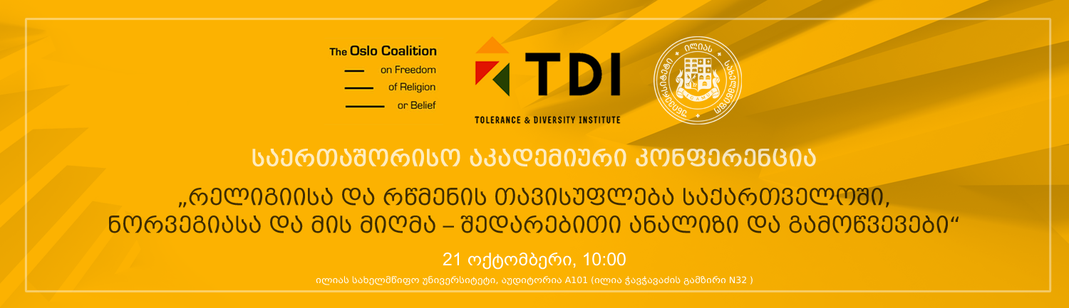 21 ოქტომბერს, 10:00 საათზე, ილიას სახელმწიფო უნივერსიტეტის A101 დარბაზში ოსლოს უნივერსიტეტთან არსებული ადამიანის უფლებათა ნორვეგიული ცენტრის (რელიგიისა და რწმენის თავისუფლების ოსლოს კოალიციის პროექტის ფარგლებში) და ტოლერანტობისა და მრავალფეროვნების ინსტიტუტის (TDI) ორგანიზებით გაიმართება საერთაშორისო აკადემიური კონფერენცია „რელიგიისა და რწმენის თავისუფლება საქართველოში, ნორვეგიასა და მის მიღმა – შედარებითი ანალიზი და გამოწვევები. ღონისძიება ეწყობა ილიას სახელმწიფო უნივერსიტეტთან თანამშრომლობით.