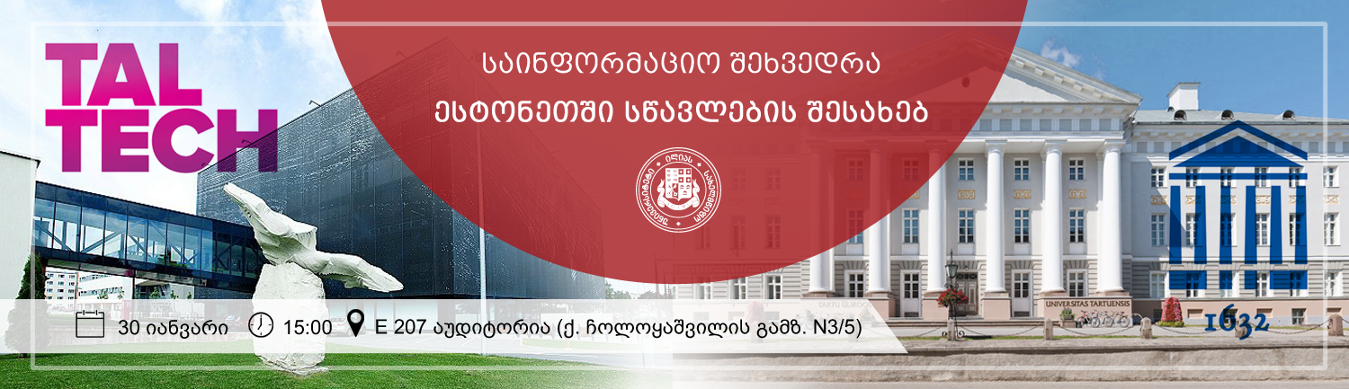30 იანვარს, 15:00 საათზე, ილიას სახელმწიფო უნივერსიტეტის E207 აუდიტორიაში ესტონური უნივერსიტეტების წარმომადგენლების ვიზიტთან დაკავშირებით მოეწყობა საინფორმაციო შეხვედრა სტუდენტებთან. შეხვედრა მიზნად ისახავს ესტონეთში სწავლით დაინტერესებული სტუდენტებისთვის ინფორმაციის მიწოდებას როგორც საბაკალავრო/სამაგისტრო პროგრამების, ასევე დაფინანსებისა და სტიპენდიის მოპოვების შესახებ. სტუდენტებს შესაძლებლობა ექნებათ, პირადად გაესაუბრონ უნივერსიტეტის წარმომადგენლებს.