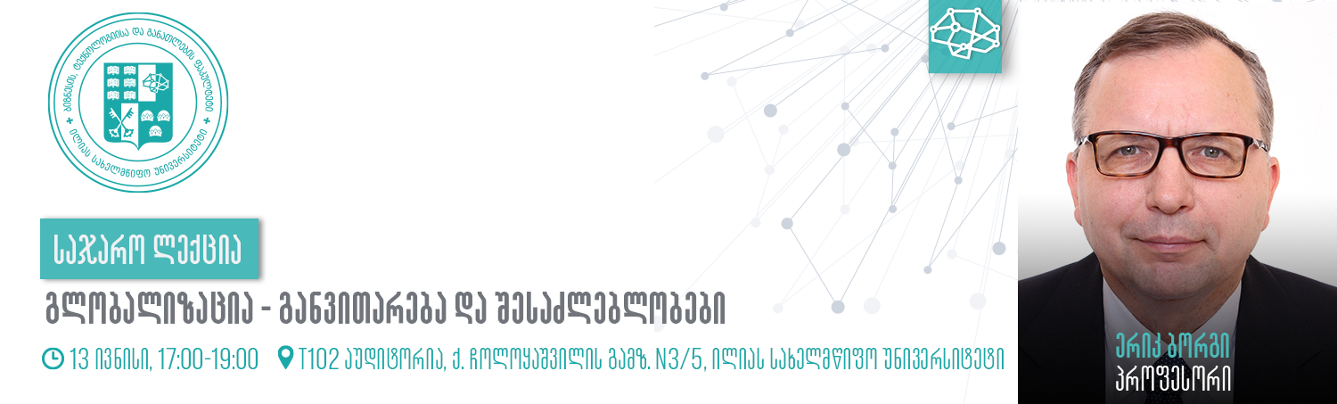 13 ივნისს, 17:00 საათზე, ილიაუნის ტექნოლოგიების კორპუსის T102 აუდიტორიაში ერიკ ბორგი, პროფესორი ბიზნესის ადმინისტრირების მიმართულებით, წაიკითხავს საჯარო ლექციას „გლობალიზაცია – განვითარება და შესაძლებლობები“.