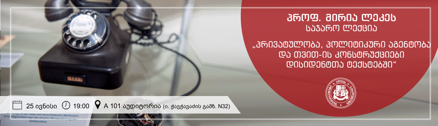 25 ივნისს, 19:00 საათზე, ილიას სახელმწიფო უნივერსიტეტის A101 აუდიტორიაში გაიმართება პროფ. მირია ლეკეს (ბოხუმი, გერმანია) საჯარო ლექცია: „პრივატულობა, პოლიტიკური აგენტობა და თვით-ის კონსტრუქციები დისიდენტთა ტექსტებში (სოლჟენიცინი, ვატი, ბირმანი)“.