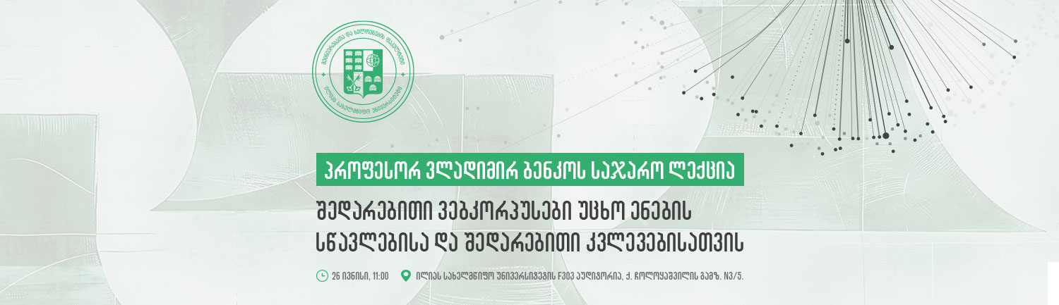 26 ივნისს, 11:00 საათზე, ილიას სახელმწიფო უნივერსიტეტის F303 აუდიტორიაში ლექსიკოგრაფიისა და ენობრივი ტექნოლოგიების ცენტრის ორგანიზებით სლოვაკეთის მეცნიერებათა აკადემიის წევრი, პროფესორი ვლადიმირ ბენკო სამაგისტრო და სადოქტორო საფეხურების სტუდენტებისათვის წაიკითხავს ლექციას „შედარებითი ვებკორპუსები უცხო ენების სწავლებისა და შედარებითი კვლევებისათვის“.