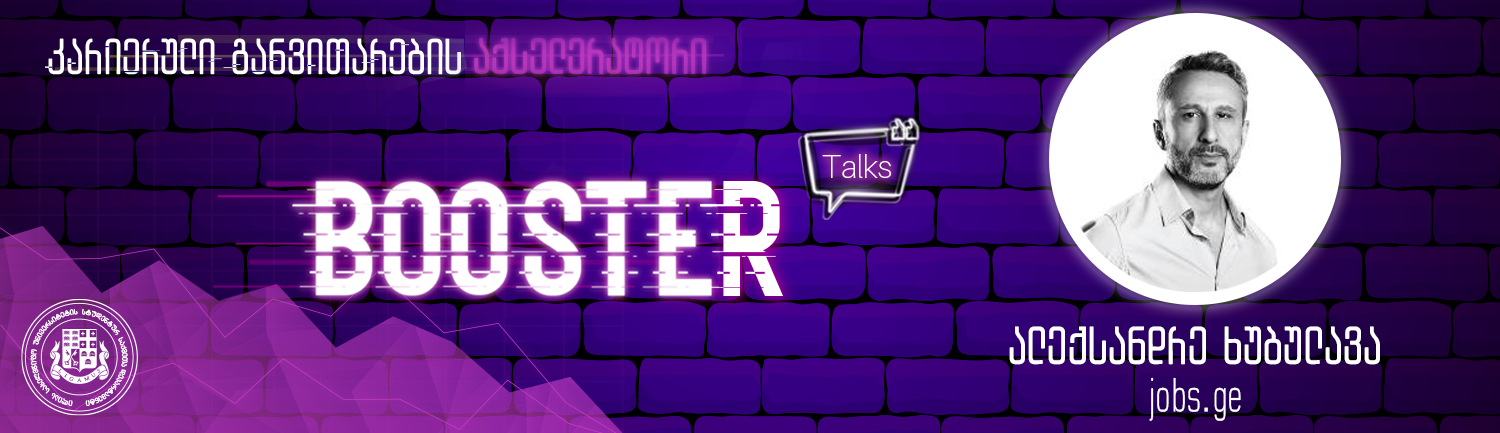 15 მაისს, პარასკევს, 15:00 საათზე, BOOSTER Talks-ის სტუმარი იქნება საქართველოში ყველაზე დიდი დასაქმების პლატფორმის, jobs.ge-ს დამფუძნებელი და დირექტორი ალექსანდრე ხუბულავა.