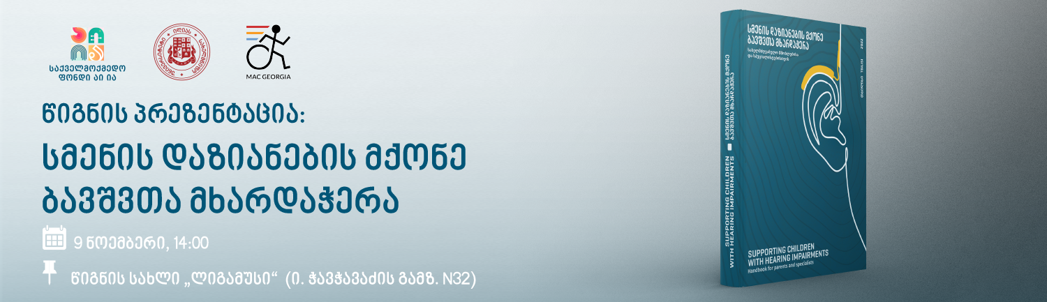 9 ნოემბერს, 14:00 საათზე, წიგნის სახლში „ლიგამუსი“ ფონდი „აი ია“ გამართავს ელექტრონული წიგნის „სმენის დაზიანების მქონე ბავშვთა მხარდაჭერა“ პრეზენტაციას.