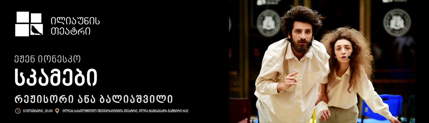 10 ნოემბერს, 20:00 საათზე, ილიას სახელმწიფო უნივერსიტეტში გაიმართება სპექტაკლი „სკამები“, აბსურდული კომედია ერთ მოქმედებად.