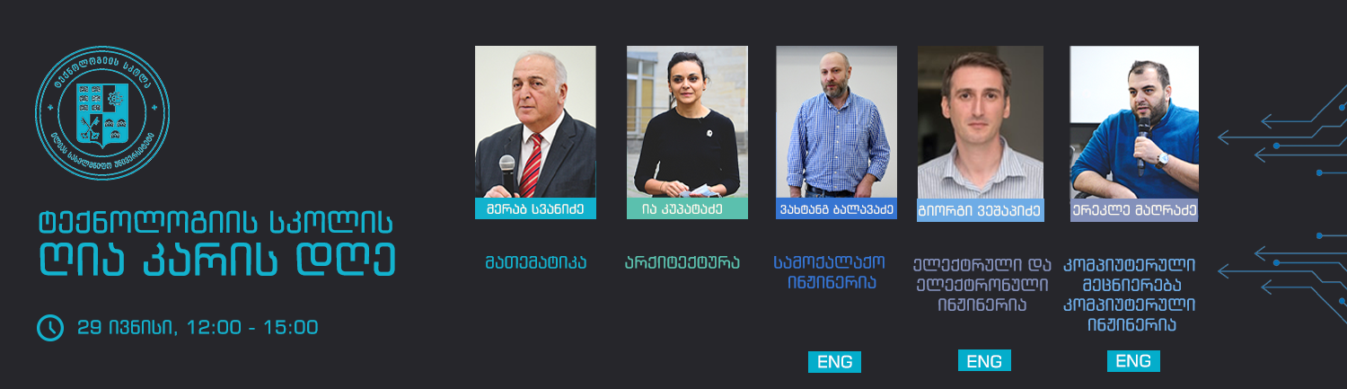 ღია კარის დღეზე  ტექნოლოგიის სკოლის მიმართულებების, პროფესიების მნიშვნელობასა და ამ მიმართულებით ილიას სახელმწიფო უნივერსიტეტში არსებული შესაძლებლობების შესახებ მოსწავლეებს ინფორმაციას გააცნობენ ილიაუნის პროფესორები: