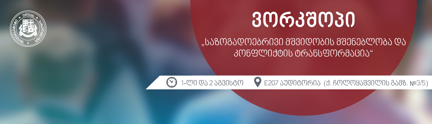 ილიას სახელმწიფო უნივერსიტეტი გიწვევთ ვორკშოპზე „საზოგადოებრივი მშვიდობის მშენებლობა და კონფლიქტის ტრანსფორმაცია“, რომელიც გაიმართება 1-ლ და 2 აგვისტოს ილიას სახელმწიფო უნივერსიტეტის E207 აუდიტორიაში.