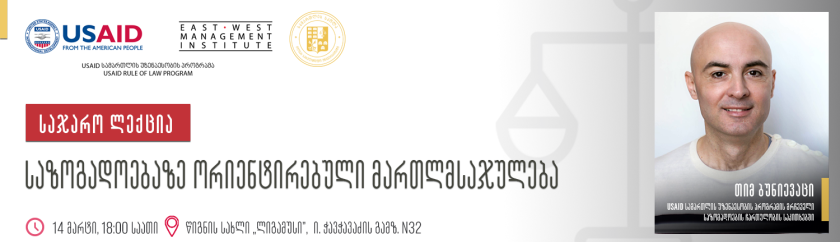 14 მარტს, 18:00 საათზე, წიგნის სახლში „ლიგამუსი“ ილიას სახელმწიფო უნივერსიტეტის სამართლის სკოლისა და USAID სამართლის უზენაესობის პროგრამის თანამშრომლობის ფარგლებში დოქტორი თიმ ბუნიევაცი წაიკითხავს საჯარო ლექციას „საზოგადოებაზე ორიენტირებული მართლმსაჯულება“. დოქტორი თიმ ბუნიევაცი, USAID სამართლის უზენაესობის პროგრამის მრჩეველი საზოგადოების ჩართულობის საკითხებში, სასამართლოს ადმინისტრაციის ჯილდოს მფლობელი ექსპერტია დიდი პრაქტიკული გამოცდილებით, ავტორია საერთაშორისო კვლევებისა საზოგადოებაზე ორიენტირებული მართლმსაჯულებისა და სასამართლო […]